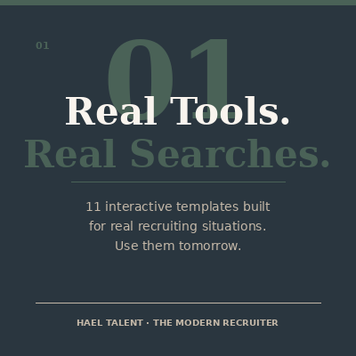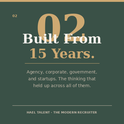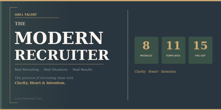 Most recruiters figure this job out on their own. No real training. No playbook. Just instinct, trial, and the occasional mistake you'd rather forget. The Modern Recruiter is built to change that. Eight modules built around real situations. Eleven professional templates you can use on a real search this week. And the perspective that comes from 15 years across agency, corporate, government, and startup environments. No jargon. No certification theatre. Just the tools and thinking that make the difference between a recruiter who reacts and one who leads.